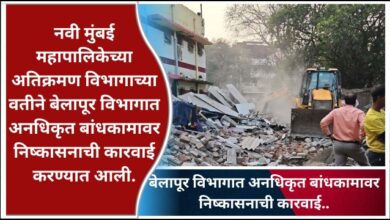 नवी मुंबई महापालिकेच्या अतिक्रमण विभागाच्या वतीने बेलापूर विभागात अनधिकृत बांधकामावर निष्कासनाची कारवाई करण्यात आली.