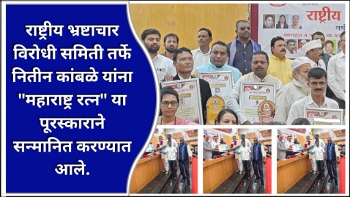 विशेष प्रतिनिधी छत्रपती संभाजीनगर दि. ०८ जूलै २०२५ काल छत्रपती संभाजी नगर येथे धार्मिक कार्यकर्ते नितीन कांबळे यांना राष्ट्रीय भ्रष्टाचार विरोधी समिती तर्फे पुरस्कार देण्यात आला. यावेळी पोलीस अधिकारी, शासकीय अधिकारी, गोरगरिब लोकांना हॉस्पिटलमध्ये मोफत उपचार मिळून देणारे, वेगवेगळ्या क्षेत्रात, चांगली कामे करणाऱ्यांना “समाज भूषण”, काहीना “समाज गौरव” म्हणून सन्मानित केले पण समितीने नितीन कांबळे यांची वेगळी दखल घेऊन १०१ लोकांमधून फक्त एकट्याला “महाराष्ट्र रत्न” या पूरस्काराने सन्मानित करण्यात आले. राष्ट्रीय भ्रष्टाचार विरोधी समिती छत्रपती संभाजीनगर घाटी हॉस्पिटल छत्रपती संभाजीनगरचे डीन. मा. शिवाजी शुक्रे साहेब यांचे हस्ते २०२४-२५ “महाराष्ट्र रत्न” म्हणून सन्मानित करण्यात आले. यावेळी बाळासाहेब चव्हाण, महेंद्र कांबळे, अजय अहिरे, विशाल लोंढे, अनिल कांबळे, टायगर, उपस्थित होते.