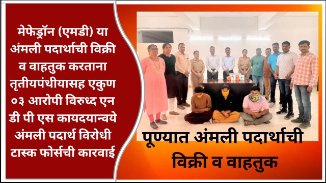 दिनांक २८/१०/२०२५ रोजी अंमली पदार्थ विरोधी टास्क फोर्स, कोल्हापूर कृती विभागाचे पोलीस अधिकारी व अंमलदार पुणे शहरातील हडपसर, वानवडी, काळेपडळ भागात पेट्रोलींग करीत असताना मांजरी ते १५ नंबर चौक रोड इंण्डेन गैस शेजारी पाकींग जवळ रोडचे कडेला हडपसर पुणे या ठिकाणी दुचाकीवर एक महिला व एक तृतीयपंथी हे संशयास्पदरित्या मिळून आल्याने त्यांना ताब्यात घेवून चौकशी केली असता त्यांनी त्यांचे नाव १) मेघा दिपक जगताप वय २७ वर्षे रा. बी/०३, उमेश स्मृती महादेव नगर, मांजरी रोड, हडपसर, पुणे. २) (तृतीयपंथी स्नेहल उर्फ गणेश शिवांब बाचे वय २१ वर्षे रा. पॅराटाइज सोसायटी, काळुबाई लेन नंबर १, ससाणेनगर रोड, हडपसर, पुणे. असे सांगितले तसेच पंचासमक्ष घेण्यात आलेल्या अंगझडती व घरइडती दरम्यान सुमारे ३,००,४००/- रुपये किमतीचा सुमार ६० ग्रॅम ०८ मिली वजनचा मेफेड्रॉन (एमडी) हा अंमली पदार्थ, वजन काटा ०२ मोबाईल व टीव्हीएस ज्यूपीटर गाडी असा एकूण ४,३१,९५०/-रुपये किंमतीचा मुददेमाल मिळून आल्याने त्यांना ताब्यात घेवून पंचासमक्ष मुद्देमाल जागीच सील करून ताब्यात घेण्यात आला. सदरचा मेफेड्रॉन (एमडी) हा कोठून आणला याबाबत महिला आरोपी मेघा जगताप हिने आरोपी क्र ०३) सलमान रालीम शेख रा. घोरपडे पेठ, उदयानाजवळ, त्रुप्ती निवारा, किर्लोराकर कॉलनी, महादेव नगर, गांजरी रोड, हडपसर, पुणे. याचेकडून आणल्याचे सांगितले असता त्याचा शोध घेवुन त्यास ताब्यात घेण्यात आले आहे. सदर आरोपी पांचे विरुदध हडपसर पोलीस ठाणे येथे गु.र.नं ९१६/२०२५ एन.डी.पी.एस ॲक्ट कलम ८ (क), २२ (क), २९ अन्वये गुन्हा दाखल करण्यात आलेला असून तिन्ही आरोपीना कायदेशिर कार्यवाही करुन अटक करण्यात आलेले आहे. सदर गुन्हयाचा पुढील तपास पोलीस निरीक्षक श्रीमती प्रेमा पाटील अंमली पदार्थ विरोधी टास्क फोर्स, कोल्हापूर कृती विभाग, पुणे या करीत आहेत.