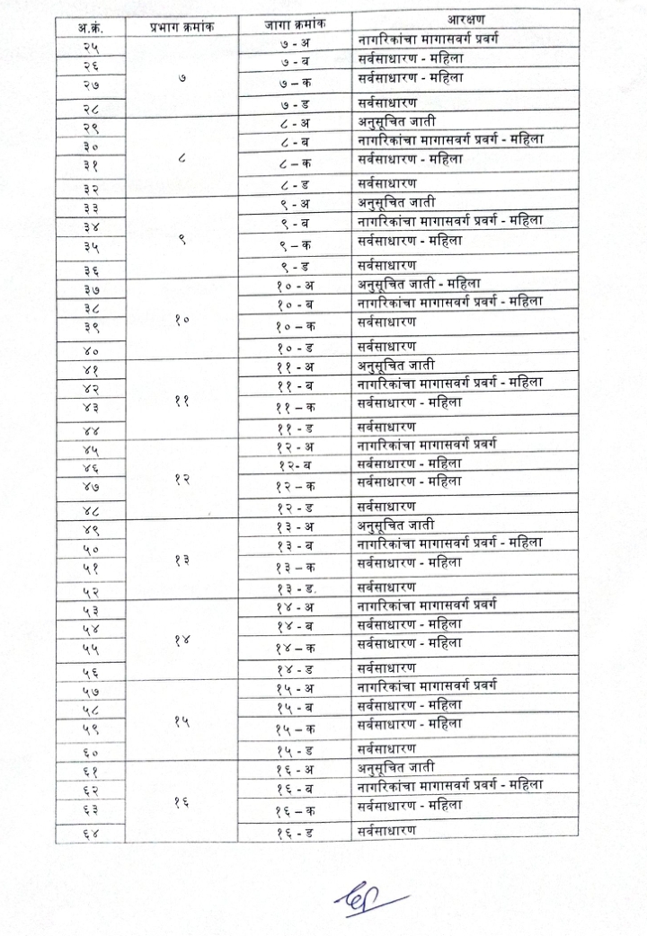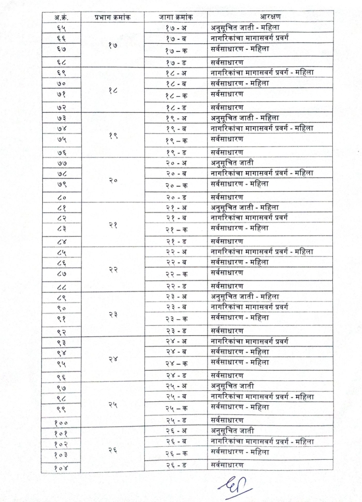 आरक्षण सोडत प्रक्रियेच्या तिसऱ्या टप्प्यात नागरिकांच्या मागासवर्ग प्रवर्ग सोडत प्रक्रिया पार पडली. त्यानंतर सर्वसाधारण महिलांच्या जागा निश्चित करण्याकरिता प्रक्रिया पूर्ण करून प्रभागनिहाय आरक्षित जागा जाहीर करण्यात आल्या.