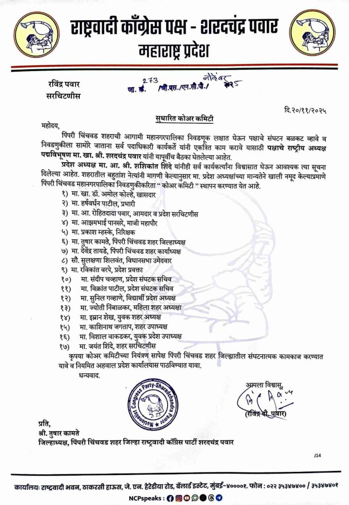 राष्ट्रवादी काँग्रेस पक्ष (श.प.) पिंपरी चिंचवड शहराची आगामी महानगरपालिका निवडणूक लक्षात घेऊन कोअर कमिटीची स्थापना..
