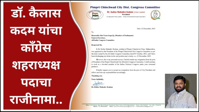वेणू गोपाल यांना दिलेल्या राजीनामा पत्रात कदम यांनी म्हटले आहे की, “मी कैलास महादेव कदम, तुम्ही मला दि. ७ ऑक्टोबर २०२१ रोजी दिलेल्या पत्रानुसार पिंपरी चिंचवड शहर अध्यक्ष पदावर काम करीत आहे. परंतु, आज सोमवार, दि.२२ डिसेंबर २०२५ रोजी मी माझ्या वैयक्तिक कारणास्तव पिंपरी चिंचवड शहर (जिल्हा) काँग्रेस पक्ष शहर अध्यक्ष पदाचा राजीनामा देत आहे. मला कार्यमुक्त करावे. ही नम्र विनंती. मी पुढे काँग्रेसचा प्राथमिक सदस्य पदावर काम करणार आहे.”