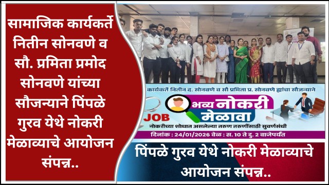 प्रतिनिधी पिंपरी चिंचवड दि. 26 जानेवारी 2026 सामाजिक कार्यकर्ते नितीन सोनवणे व सौ प्रमिता प्रमोद सोनवणे यांच्या सौजन्याने दिनांक २४/०१/२०२६ रोजी पिंपळे गुरव मध्ये प्रथमच भव्य नोकरी मेळावा आयोजित करण्यात आला होता, जवळकर नगर मध्ये श्रीकृष्ण मंदिर सभागृहामध्ये हा सोहळा पार पडला, १० वी, १२ वी, पदवीधर व डिप्लोमा होल्डर, आय.टी.आय. झालेल्या उमेदवारांना करिता नोकरीची थेट मुलाखती आयोजित करून जागेवर नियुक्ती पत्र देण्यात आली, जवळपास २० वेगवेगळ्या प्रकारच्या कंपनीचे प्रतिनिधी मुलाखती साठी आले होते. तसेच जवळपास २०० ते २५० उमेदवार मुलाखतीसाठी जमा झाले होते त्यापैकी अनेक उमेदवारांना नियुक्ती पत्र सादर करण्यात आले, अनेक तरुण तरुणींनी ह्या उपक्रमाला भरघोस प्रतिसाद दिला. कार्यक्रमाचे आयोजन व नियोजन सामाजिक कार्यकर्ते नितीन सोनवणे व सौ. प्रमिता प्रमोद सोनवणे ह्यांनी केले होते तसेच प्रमुख पाहुणे म्हणून नवनिर्वाचित नगरसेवक मा. शशिकांत आप्पा कदम यांनी विद्यार्थ्यांना मार्गदर्शन केले, तसेच युवानेते शंतून डोळस, संतोष भाऊ काची, अश्विन भाऊ खुडे, फिरोज शेख, सूरेश सकट, मनोहर पाटील उपस्थित होते, तसेच सामाजिक कार्यकर्ते अरविंद कदम, पराग कांबळे, विज्ञान रणदिवे उपस्थित होते