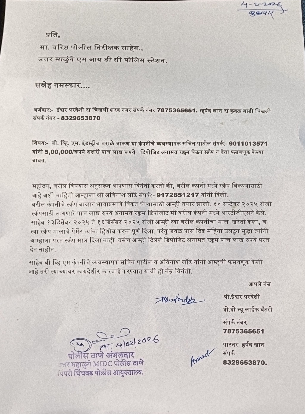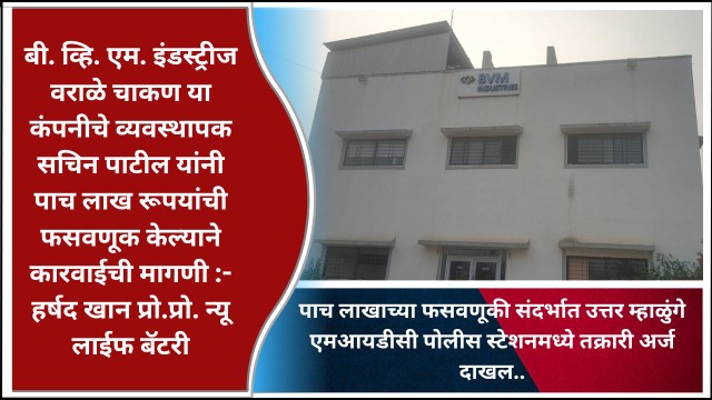 बी. व्हि. एम. इंडस्ट्रीज वराळे चाकण या कंपनीचे व्यवस्थापक सचिन पाटील यांनी पाच लाख रूपयांची फसवणूक केल्याने कारवाईची मागणी :- हर्षद खान प्रो.प्रो. न्यू लाईफ बॅटरी