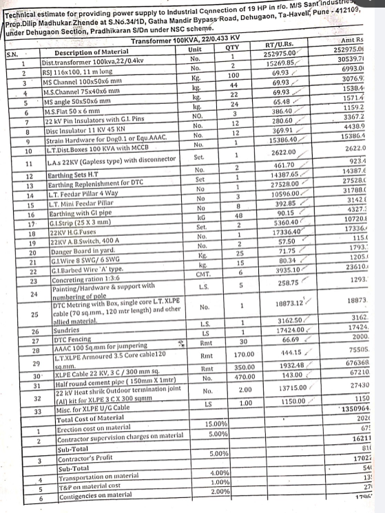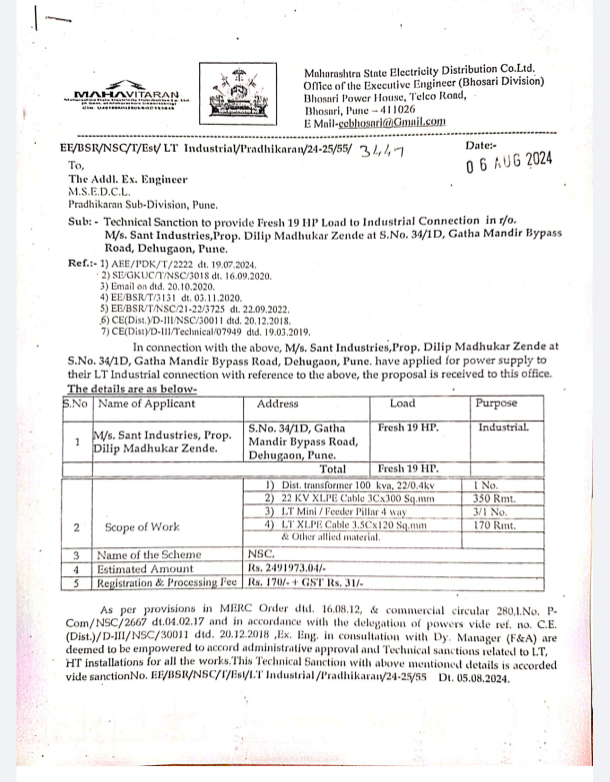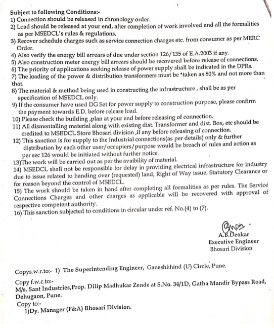 ७) मे. संत इंडस्ट्रीज, प्रोप्रा. दिलीप मधुकर झेंडे, सर्व्हे नं. ३४/१डी, गाथा मंदीर, बायपास रोड, देहूगांव, पुणे या विज ग्राहकास १९ एच.पी. /औद्योगिक विज पुरवठा मंजूर करुन विद्युत रोहित्र बसवून चालू केले आहे, परंतू विद्युत रोहित्रावर संत इंडस्ट्रीज या ग्राहकास विद्युत पुरवठा देवून विज बिल चालू न करता दुसऱ्या विद्युत ग्राहकास विज मीटर देण्यात आलेले आहेत. पंरतू नवीन विज पुरवठा योजनेअंतर्गत ज्या नावाने विद्युत रोहित्र मंजूर झाला व बसवून चालू केला, परंतू संबंधित विजग्राहक चालू करण्यात आलेला नाही.