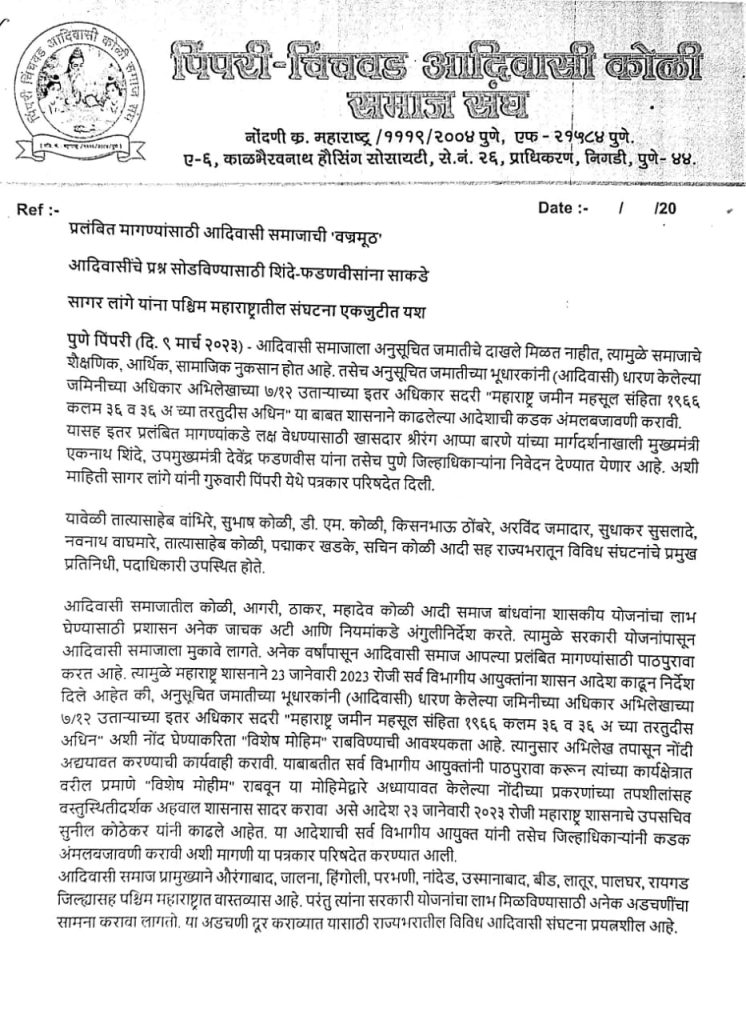 आदिवासी समाजातील कोळी, आगरी, ठाकर, महादेव कोळी आदी समाज बांधवांना शासकीय योजनांचा लाभ घेण्यासाठी प्रशासन अनेक जाचक अटी आणि नियमांकडे अंगुलीनिर्देश करते. त्यामुळे सरकारी योजनांपासून आदिवासी समाजाला मुकावे लागते. अनेक वर्षांपासून आदिवासी समाज आपल्या प्रलंबित मागण्यांसाठी पाठपुरावा करत आहे. त्यामुळे महाराष्ट्र शासनाने 23 जानेवारी 2023 रोजी सर्व विभागीय आयुक्तांना शासन आदेश काढून निर्देश दिले आहेत की, अनुसूचित जमातीच्या भूधारकांनी (आदिवासी) धारण केलेल्या जमिनीच्या अधिकार अभिलेखाच्या ७/१२ उताऱ्याच्या इतर अधिकार सदरी “महाराष्ट्र जमीन महसूल संहिता १९६६ कलम ३६ व ३६ अ च्या तरतुदीस अधिन” अशी नोंद घेण्याकरिता “विशेष मोहिम” राबविण्याची आवश्यकता आहे. त्यानुसार अभिलेख तपासून नोंदी अद्ययावत करण्याची कार्यवाही करावी. याबाबतीत सर्व विभागीय आयुक्तांनी पाठपुरावा करून त्यांच्या कार्यक्षेत्रात वरील प्रमाणे “विशेष मोहीम” राबवून या मोहिमेद्वारे अध्यायावत केलेल्या नोंदीच्या प्रकरणांच्या तपशीलांसह वस्तुस्थितीदर्शक अहवाल शासनास सादर करावा असे आदेश २३ जानेवारी २०२३ रोजी महाराष्ट्र शासनाचे उपसचिव सुनील कोठेकर यांनी काढले आहेत. या आदेशाची सर्व विभागीय आयुक्त यांनी तसेच जिल्हाधिकाऱ्यांनी कडक अंमलबजावणी करावी अशी मागणी या पत्रकार परिषदेत करण्यात आली.