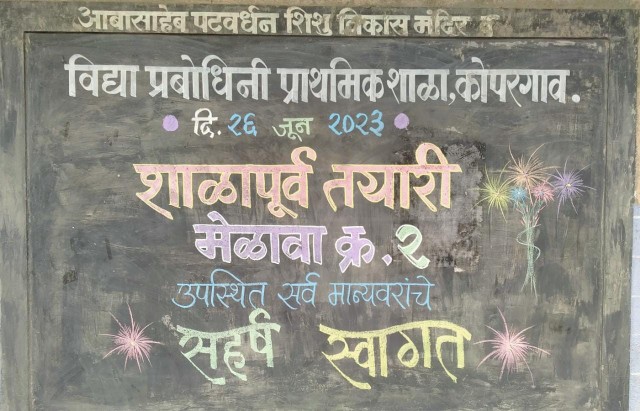 कोपरगाव विद्या प्रबोधिनी प्राथमिक शाळेमध्ये दि.२६/०६/२०२३ रोजी शालेय प्रांगणात शाळा प्रवेश उत्सव साजरा करण्यात.या प्रसंगी कार्यक्रमाचे अध्यक्ष सेवानिवृत्त प्राध्यापक श्री.राजेंद्र जोशी सर, एस. एस. जी. एम. कॉलेजचे प्राध्यापक श्री. अमोल चंदनशिवे, श्री प्रसाद साबळे व अनुवाद आपला न्युजचे पत्रकार श्री. अजय विघे सर या मान्यवरांच्या हस्ते सरस्वती पूजन करण्यात आले. कार्यक्रमाचे प्रास्ताविक शाळेचे मुख्याध्यापक श्री. गवळी सर यांनी केले. प्रास्ताविकात प्रवेशित विद्यार्थ्यांच्या पालकांना विकास पत्र बाबत माहिती देण्यात आली. शालापूर्व तयारी मेळावा आयोजित करण्यामागचा उद्देश पालकांच्या लक्षात आणून दिला. मुल शाळेत पहिल्यांदाच ज्या वेळेस येते त्या वेळी त्याच्या मनावर कुठल्याही प्रकारचे दडपण न येता त्याने आनंदाने शाळेत यावे, शालेय वातावरणात रमावे आणि हिच आपलेपणाची भावना बालकाच्या मनात रुजावी म्हणून आजच्या कार्यक्रमाचे नियोजन करण्यात आले. इयत्ता १ ली तील दखलपात्र बालकांचा शारीरिक, भावनिक, बौद्धिक, भाषिक विकास कितपत झाला आहे हे पडताळणी करून खेळीमेळीच्या वातावरणात या बालकांमध्ये शाळेविषयी गोडी निर्माण व्हावी हा उद्देश शाळा पूर्वतयारी मेळावा आयोजित करून साध्य करण्यात आला.