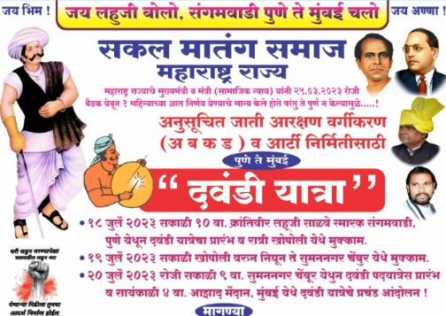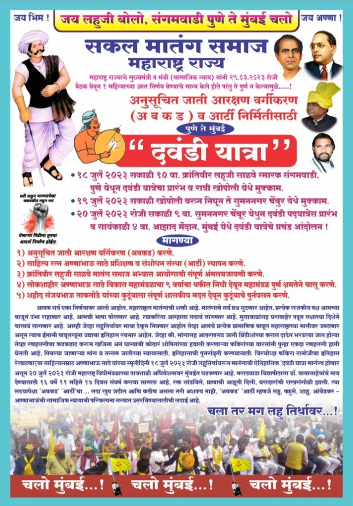 प्रतिनिधी पिंपरी चिंचवड महाराष्ट्रात सकल मातंग समाजाच्यावतीने 18 जुलै ते 22 जुलै दवंडी यात्रा करण्याचे नियोजन ठरले आहे. त्यामध्ये सहभागी होण्यासंदर्भात विचार विनिमय करून सहभागी होण्यासाठी महत्त्वपूर्ण बैठक रविवार दिनांक ९जुलै २०२३ रोजी दुपारी १२:०० वाजता “साहित्यरत्न लोकशाहीर आण्णाभाऊ साठे सांस्कृतिक भवन यमुनानगर निगडी” या ठिकाणी आयोजित केली आहे.