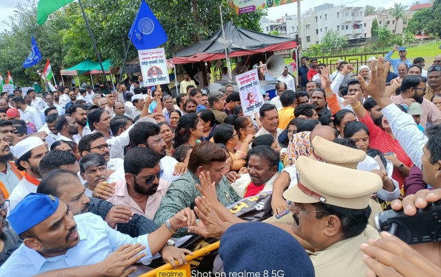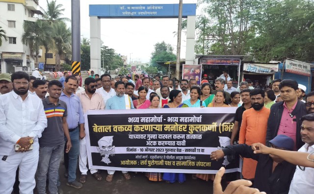 प्रतिनिधी पिंपरी चिंचवड १० ऑगस्ट २०२३ संभाजी भिडे यांच्या वरती गुन्हा दाखल करण्यासाठी सर्व पक्ष संघटना मिळून पिंपरी चिंचवड पोलीस आयुक्तालयावरती मोर्चा काढण्यात आला. मात्र पोलिसांनी हा मोर्चा अर्ध्यावरच अडवण्यात आला. कारण कालच मोर्चाला परवानगी नाकारली गेली असल्याने मोर्चा आडवण्यात आला. या मोर्च्यामध्ये महीला पदाधिकारी सामाजिक कार्यकर्ते नेते मोठ्या प्रमाणात उपस्थित होते क्रांतीसुर्य महात्मा ज्योतिबा फुले राष्ट्रपिता महात्मा गांधी यांच्या बद्दल अपशब्द वापरल्याने व वेळोवेळी अशाच स्वरूपाचे अपशब्द देश, स्वातंत्रसैनिक, राष्ट्रगीत, महिला या व अशा संदर्भात वापरले जातात म्हणून नागरिक व सामाजिक संघटना व राजकीय पक्षांचे नेते, कार्यकर्ते तसेच सामान्य नागरिकांमध्ये संतापाची लाट उसळलेली पाहायला मिळत आहे. या अनुषंगाने आज विविध संघटना सर्वपक्षीय नेते कार्यकर्ते यांनी यांनी मनोहर कूलकर्णी ( संभाजी भिडे ) यांच्यावर गुन्हा दाखल करून अटक करावी यासाठी मोर्चा कढण्यात येणार होता मात्र तो मोर्चा जिथे सूरू झाला तिथेच पोलीसांनी आडवण्यात आला सकाळी आकरा वाजता या मोर्चा ला सुरुवात होणार होती मात्र पोलीसांनी मोर्चा अडवण्यात आल्यानंतर ज्या ठिकाणी सुरुवात झाली होती त्याच ठिकाणी सर्व कार्यकर्ते आंदोलनासाठी बसले होते. नंतर आंदोलकांच्या शिष्टमंडळाला आयुक्तांना भेटण्याची परवानगी देण्यात आली. मणिपूर मध्ये जो प्रकार घडला आहे त्यावरती पडदा पडावा म्हणून हे सरकार मनोहर कूलकर्णी ( संभाजी भिडे ) सारखा माणसाला पुढे करून काही ही बेताल वक्तव्य करायला लावत आहे का? आम्ही सर्व संघटना मिळून केंद्र सरकार तसेच राज्य सरकार यांना विनंती करत आहोत की लवकरात लवकर गुन्हे दाखल करून संभाजी भिडे यांना अटक करा नाहीतर भविष्यामध्ये जी काही वादळे उठतील त्याला जवाबदार केंद्र सरकार व राज्य सरकार राहील असा इशारा देण्यात आला. यावेळी मारुती भापकर ( सामाजिक कार्यकर्ते ), मानव कांबळे ( सामाजिक कार्यकर्ते ), देवेंद्र तायडे ( नेते राष्ट्रवादी काँग्रेस पार्टी शरद पवार गट ), सुनीता शिंदे ( जिजाऊ बिग्रेड पुणे जिल्हा अध्यक्षा ), संजीवनी पुराणिक ( नेत्या राष्ट्रवादी काँग्रेस पार्टी ), राजन नायर ( नेते राष्ट्रवादी काँग्रेस पार्टी शरद पवार गट ), यांनी आपले विचार मांडले या वेळी सतिश काळे, काशिनाथ नखाते, आण्णासाहेब कसबे, शांताराम खूडे, विठ्ठल कळसे, भारत विठ्ठलदास, ब्रम्हानंद जाधव, बापूसाहेब गायकवाड, जितेंद्र छाबडा, बिषप प्रदिप चांदेकर, बिषप अशोक निकाळजे, बिषप मायक राज नाडार, डेविड काळे, निशिकांत चांदेकर, आण्णा पाखरे, दराडे, माऊली बोराटे, बाळासाहेब वाघमारे, ज्योती जाधव, संजिवनी पूराणिक, सुधीर मुरूडकर, राम नला