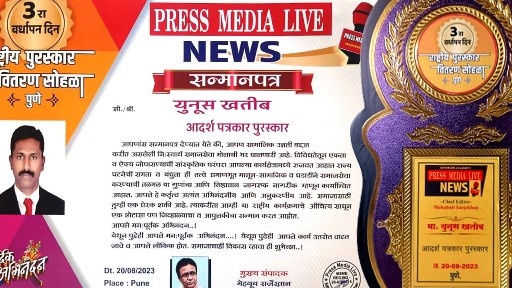 प्रतिनिधी पुणे दिनांक २१ ऑगस्ट २०२३ पिंपरी चिंचवड येथील पत्रकार युनूस खतीब यांनी पत्रकारिता क्षेत्रात केलेल्या उल्लेखनीय कामगिरी बद्दल आदर्श पत्रकार पुरस्कार देऊन सन्मानित करण्यात आले. सन्मानचिन्ह, मानपत्र असे या पुरस्काराचे स्वरूप आहे.