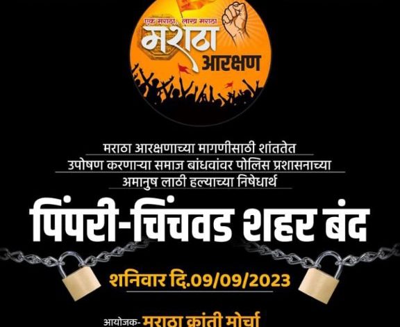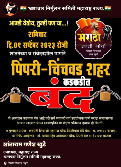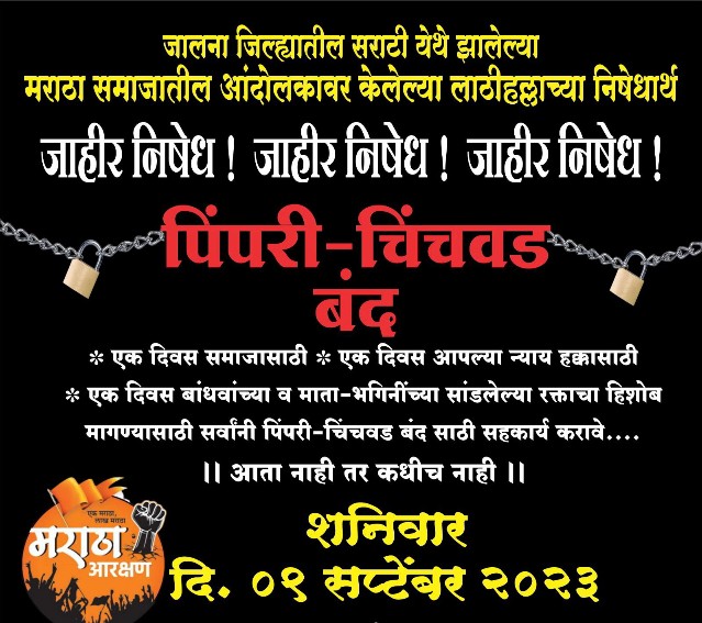 प्रतिनिधी पिंपरी चिंचवड ०६ सप्टेंबर २०२३ जालण्यातील मराठा आरक्षण आंदोलन वेळी आंदोलकांवर झालेल्या अमानूष लाठी हल्याच्या निषेधार्थ पिंपरी चिंचवड शहर मराठा क्रांती मोर्चाच्या वतिने पिंपरी चिंचवड बंदची हाक या विषयाचे पोस्टर सोशल मिडियावर फिरत आहेत शनिवार दि. ०९ सप्टेंबर २०२३ रोजी पिंपरी चिंचवड शहर मराठा क्रांती मोर्चाच्या वतिने पिंपरी चिंचवड बंदची हाक दिल्याचे समजते आहे. या मोर्चाला रिपब्लिकन सेना पिंपरी चिंचवड शहर मुकुंद रणदिवे निरिक्षक पिंपरी चिंचवड शहर व भ्रष्टाचार निर्मूलन समिती महा. राज्य शातांराम खूडे उपाध्यक्ष महा. राज्यच्या वतिने जाहिर पाठींबा दिला आहे. अशा ही पोस्ट सोशल मिडियावर वायरल होताना दिसत आहे.