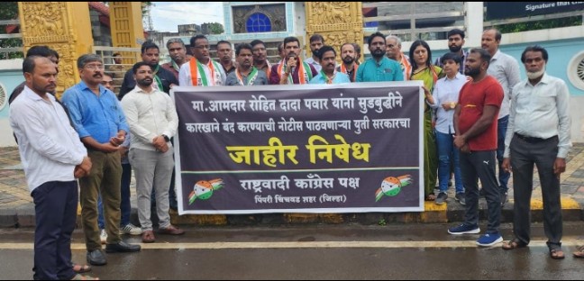 आमदार रोहित पवार यांना महाराष्ट्र प्रदूषण नियंत्रण मंडळाने मध्यरात्री दोन वाजता त्यांचे कारखाने पुढील ७२ तासात बंद करण्याबाबत नोटीस बजावली आहे या नोटीस म्हणजे राज्य सरकारने केलेले सुडबुद्धीचे राजकारण आहे. त्याचा निषेध करण्यासाठी पिंपरी चिंचवड शहर राष्ट्रवादी काँग्रेस पक्षाच्या शरद पवार गट वतीने शुक्रवारी पिंपरीतील भारतरत्न डॉ. बाबासाहेब आंबेडकर पुतळा चौक “भिमसृष्टी” येथे तुषार कामठे यांच्या नेतृत्वाखाली निदर्शने करण्यात आली. यावेळी