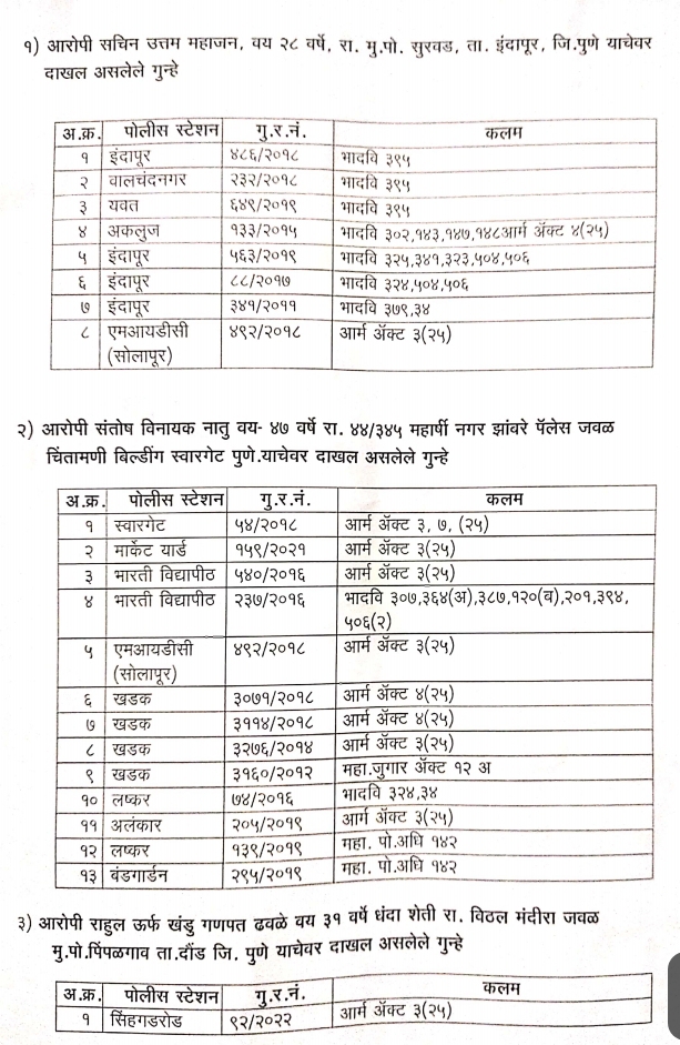 दाखल गुन्हयाचे तपासा दरम्यान पिस्टल विक्री करणारे आरोपी १) सचिन उत्तम महाजन, रा. मु.पो. सुरवड, ता. इंदापूर, जि. पुणे २) संतोष विनायक नातु रा. ४४/३४५ महर्षीनगर झांबरे पॅलेसजवळ चिंतामणी बिल्डींग, स्वारगेट, पुणे. ३) राहुल ऊर्फ खंडु गणपत ढवळे रा. विठल मंदीरा जवळ मु.पो. पिंपळगाव ता. दौंड जि. पुणे यांना अटक करुन, पोलीस कोठडी दरम्यान आरोपीतांकडे कौशल्य पुर्ण तपास करुन त्यांचे कडून ०४ पिस्टल व १० राऊंड हस्तगत करुन जप्त करण्यात आले.