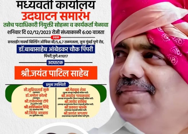 राष्ट्रवादी पिंपरी चिंचवड शहर जिल्हा मध्यवर्ती कार्यालयाचे उदघाटन शनिवार दि. २ डिसेंबर रोजी सायंकाळी ६ वाजता पक्षाचे प्रदेशाध्यक्ष जयंत पाटील यांच्या हस्ते होणार आहे. त्यानंतर जाहीर सभा डालको ग्राउंड, एच. ए. कंपनीच्या बाजूला असणाऱ्या मैदानात होणार आहे. यावेळी सुप्रिया सुळे, अमोल कोल्हे,राजेश टोपे, जितेंद्र आव्हाड,एकनाथ खडसे,प्रकाश म्हस्के, प्रशांत जगताप, जावेद हबीब,मेहबूब शेख, यावेळी पक्षाचे विविध पदाधिकारी व कार्यकर्ते मोठ्या संख्येने उपस्थित राहणार आहेत.