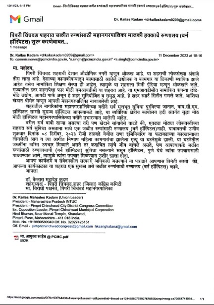 आपण कार्यक्षम व संवेदनशील सरकारी अधिकारी असल्याने या (ईमेल) पत्राद्वारे आपणास विनंती करतो की, आपल्या कार्यकाळात या शहरात एक सुसज्ज असे जळीत रुग्णांसाठी रुग्णालय (बर्न हॉस्पिटल) व्हावे. असे अध्यक्ष पिंपरी चिंचवड शहर जिल्हा काॅंग्रेस कमिटी डाॅ. कैलास कदम यांनी ईमेल द्वारे प्रशासनास कळविल्याचे दिसते आहे.