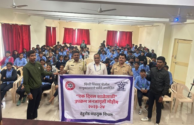 प्रतिनिधी पिंपरी-चिंचवड दि. १६ डिसेंबर २०२३ मा. पोलीस आयुक्त कार्यालय पिंपरी चिंचवड कार्यक्षेत्रामध्ये वाहतूक शाखेचे प्रत्येक प्रभारी अधिकारी यांनी आपापले विभागामध्ये महिन्याच्या दर आठवडयामध्ये दर गुरुवारी “एक दिवस शाळेसाठी” हा उपक्रम राबविणेत येत आहे. या उपक्रमाकरीता १ अधिकारी, २ अंमलदार यांचे नियोजन करुन प्रत्येक विभागातुन शाळेमध्ये मुलांना वाहतुकीचे नियम, व्यसनाधीनता, समाज माध्यम, सायबर गुन्हेगारी, याबाबत मार्गदर्शन करण्याकरीता नेमणुक करण्यात येत आहे.