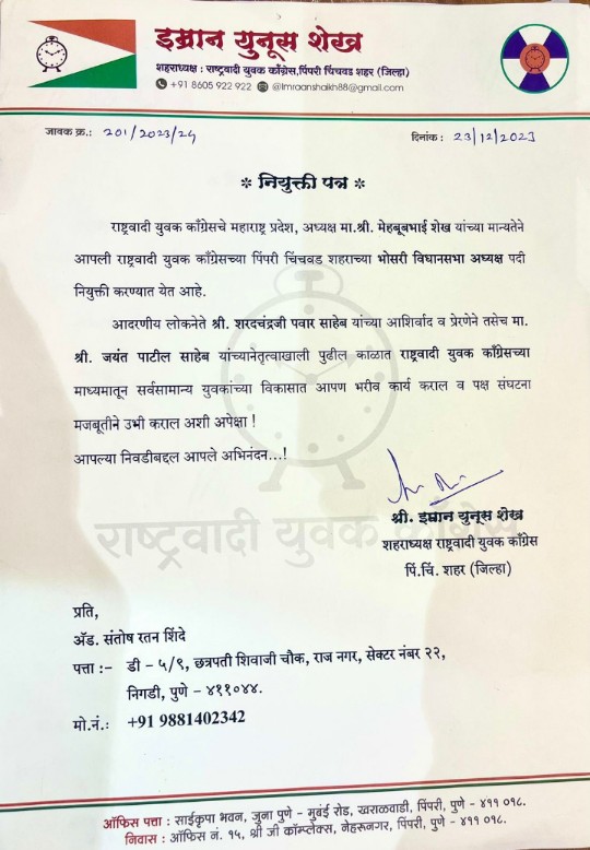 प्रतिनिधी मनिषा पवार पिंपरी चिंचवड दि. २६ डिसेंबर २०२३ रुपीनगर निगडी भागात स्वराज्य विश्व सेवा प्रतिष्ठानच्या माध्यमातून गेली १५ वर्षे सामाजिक कार्यातून लोकांमध्ये आपली वेगळी छाप निर्माण केलेले. उच्चशिक्षित युवक ॲड. संतोष रतन शिंदे यांची राष्ट्रवादी युवक काँग्रेस पिंपरी चिंचवड शहराच्या भोसरी विधानसभा अध्यक्षपदी निवड करण्यात आली. युवक शहराध्यक्ष इम्रान शेख आणि कार्याध्यक्ष सागर तापकीर यांच्या हस्ते ही निवड करण्यात आली. संतोष शिंदे हे पेशाने वकील असून अखिल भारतीय मराठी नाट्य परिषदेचे पिंपरी चिंचवड शहराचे खजिनदार देखील आहेत. त्यामुळे प्रभागातील तसेच शहरातील नाट्यकला, साहित्य, व सामाजिक क्षेत्रातील लोकसंपर्क दांडगा असून त्याचा फायदा राष्ट्रवादी काँग्रेस पक्षास होणार आहे.