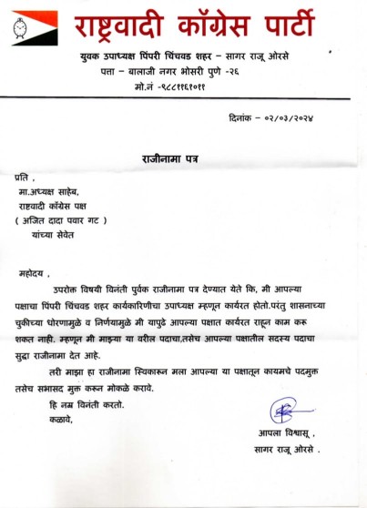 प्रतिनिधी पिंपरी चिंचवड दि. ०२ मार्च २०२४ सागर ओरसे यांनी राष्ट्रवादी युवक काँग्रेस पार्टीच्या (अजितदादा पवार गट) युवक उपशहराध्यक्ष पिंपरी चिंचवड शहर पदाचा राजीनामा दिला. पक्षाची स्थापना शरद पवार साहेबांनी केल्यापासून पक्ष अजितदादा पवार यांच्याकडे जाण्यापर्यंत पिढ्यान पिढ्या आम्ही राष्ट्रवादी काँग्रेस पक्षाचे काम केले. आज अत्यंत जड अंतकरणाने पक्षातील पदाचा राजीनामा दिला. पक्षाचा राजीनामा देत असताना कसला ही वैयक्तिक स्वार्थ नाही. परंतु सामाजिक जीवन जगत असताना सामाजिक काम करत असताना, काही चुकीच्या धोरणांकडे दुर्लक्ष करू शकत नाही.