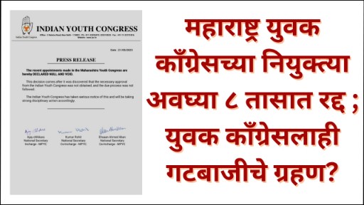 महाराष्ट्र युवक काँग्रेसच्या नियुक्त्या अवघ्या ८ तासात रद्द ; युवक काँग्रेसलाही गटबाजीचे ग्रहण?