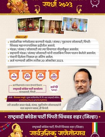 स्पर्धेसाठी अर्ज भरण्याची अंतिम तारीख २० सप्टेंबर २०२३ असेल. अर्ज मिळण्याचे व भरून देण्याचे ठिकाण राष्ट्रवादी कॉंग्रेस पार्टी कार्यालय, खराळवाडी, पिंपरी असून अर्जासाठी ५०० रु. इतके शुल्क असेल. तरी जास्तीत जास्त मंडळे, संस्था, गृहनिर्माण सोसायटयांनी या सार्वजनिक गणेशोत्सव स्पर्धेत सहभाग घ्यावा, असे आवाहन शहर (जिल्हा) राष्ट्रवादी काँग्रेसतर्फे करण्यात आले आहे.