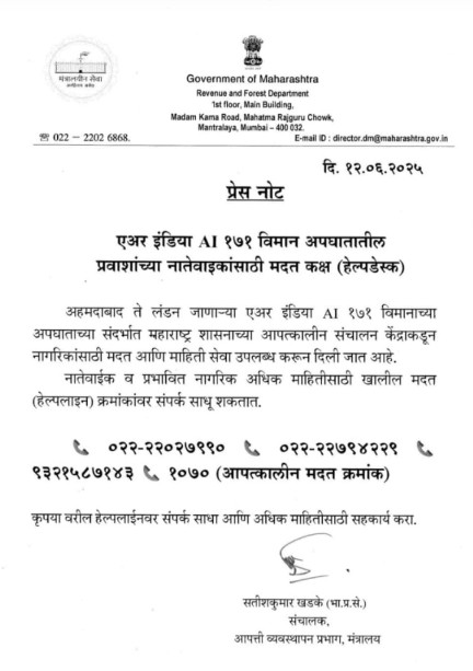 प्रतिनीधी सतिश वि.पाटील मुबंई दि. १२ जून २०२५ अहमदाबादमधील मेघानीजवळ कोसळलेल्या एअर इंडियाचे प्रवासी विमान टेकऑफच्या अगदी १० मिनीटांत कोसळल्याची धक्कादायक घटना घडली आहे. युद्ध पातळीवर रेस्क्यू ऑपरेशन राबवण्याचे आदेश मुख्यमंत्री पटेल यांनी दिले आहे. एअर ॲंम्ब्युलन्स घटनास्थळी दाखल झाली असून बचावकार्य सुरु आहे. हे विमान लंडनला जातं होतं आणि टेकऑफच्या वेळीच हे विमान कोसळल्याची माहिती समोर आली आहे. अपघातवेळी विमानात २४२ प्रवासी होते. जखमींना बाजूलाच असणाऱ्या सरकारी रुग्णालयात उपचारांसाठी तातडीने दाखल करण्यात आलं आहे. तसेच पंतप्रधान नरेंद्र मोदी, केंद्रीय गृहमंत्री अमित शहा अहमदाबादच्या दिशेनं रवाना झाले. (आपत्कालिन क्रमांक: 18005691444) दिला आहे.