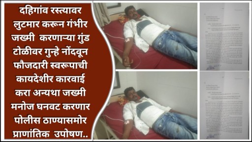 दहिगांव रस्त्यावर लुटमार करून गंभीर जख्मी करणाऱ्या गुंड टोळीवर गुन्हे नोंदवून फौजदारी स्वरूपाची कायदेशीर कारवाई करा अन्यथा जख्मी मनोज घनवट करणार पोलीस ठाण्यासमोर प्राणांतिक उपोषण..